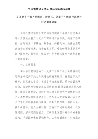 【七哥公文】2025年:全县党员干部“提能力、转作风、促实干”能力作风提升行动实施方案+更多免费公文+VX:QiGeGongWen2024+更多免费公文+VX:QiGeGongWen2024