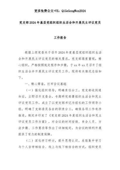 【七哥公文】2025年:党支部2024年基层党组织组织生活会和开展民主评议党员工作报告+更多免费公文+VX:QiGeGongWen2024+更多免费公文+VX:QiGeGongWen2024