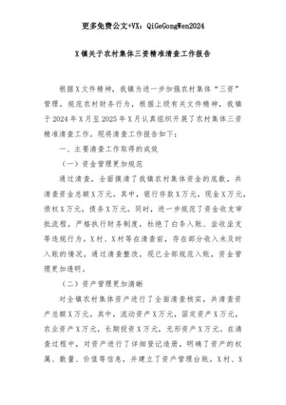 【七哥公文】2025年:X镇关于农村集体三资精准清查工作报告+更多免费公文+VX:QiGeGongWen2024+更多免费公文+VX:QiGeGongWen2024