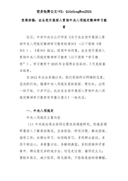 【七哥公文】2025年:党课讲稿:在全党开展深入贯彻中央八项规定精神学习教育+更多免费公文+VX:QiGeGongWen2024+更多免费公文+VX:QiGeGongWen2024