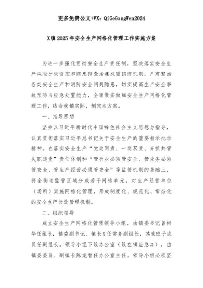 【七哥公文】2025年:X镇2025年安全生产网格化管理工作实施方案+更多免费公文+VX:QiGeGongWen2024+更多免费公文+VX:QiGeGongWen2024