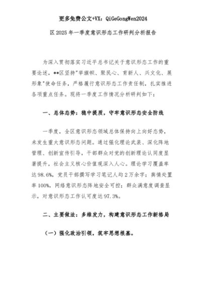 【七哥公文】2025年:区2025年一季度意识形态工作研判分析报告+更多免费公文+VX:QiGeGongWen2024+更多免费公文+VX:QiGeGongWen2024