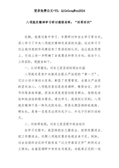 【七哥公文】2025年:八项规定精神学习研讨感悟材料:“四再四问”+更多免费公文+VX:QiGeGongWen2024+更多免费公文+VX:QiGeGongWen2024