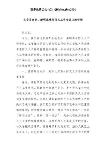 【七哥公文】2025年:在全县春分、清明森林防灭火工作会议上的讲话+更多免费公文+VX:QiGeGongWen2024+更多免费公文+VX:QiGeGongWen2024