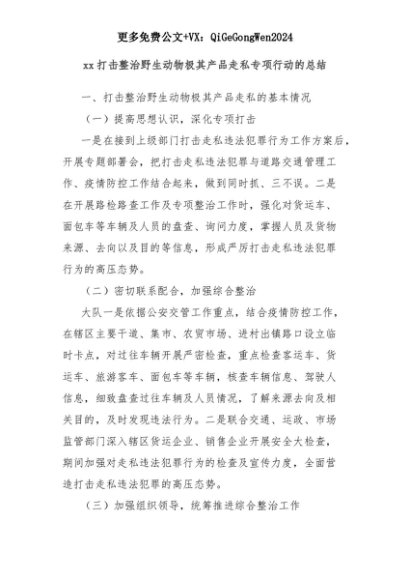 【七哥公文】2025年:xx打击整治野生动物极其产品走私专项行动的总结+更多免费公文+VX:QiGeGongWen2024+更多免费公文+VX:QiGeGongWen2024