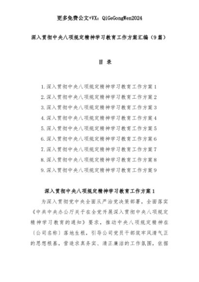 【七哥公文】2025年:(9篇)深入贯彻中央八项规定精神学习教育工作方案汇编+更多免费公文+VX:QiGeGongWen2024+更多免费公文+VX:QiGeGongWen2024