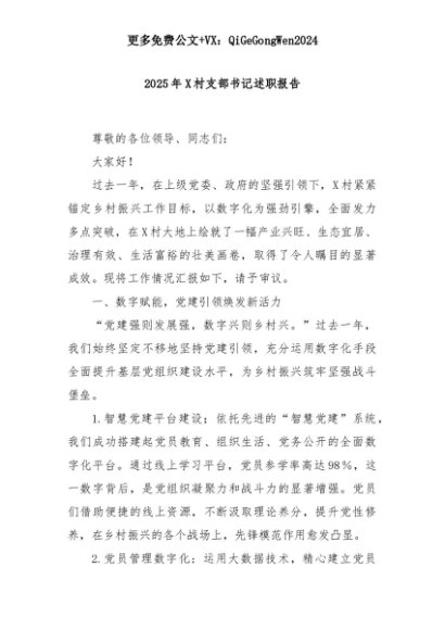 【七哥公文】2025年:2025年X村支部书记述职报告+更多免费公文+VX:QiGeGongWen2024+更多免费公文+VX:QiGeGongWen2024