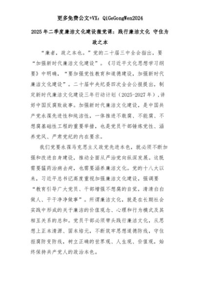 【七哥公文】2025年:2025年二季度廉洁文化建设微党课:践行廉洁文化守住为政之本+更多免费公文+VX:QiGeGongWen2024+更多免费公文+VX:QiGeGongWen2024