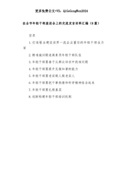 【七哥公文】2025年:(8篇)在全市年轻干部座谈会上的交流发言材料汇编+更多免费公文+VX:QiGeGongWen2024+更多免费公文+VX:QiGeGongWen2024