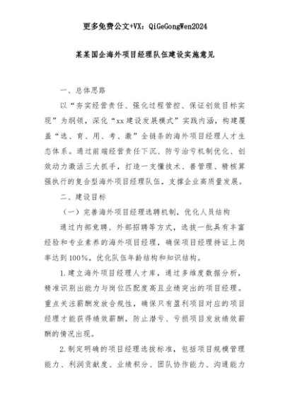 【七哥公文】2025年:某某国企海外项目经理队伍建设实施意见+更多免费公文+VX:QiGeGongWen2024+更多免费公文+VX:QiGeGongWen2024