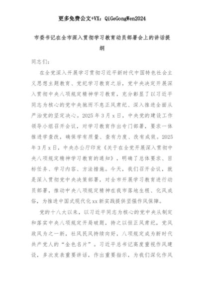 【七哥公文】2025年:市委书记在全市深入贯彻学习教育动员部署会上的讲话提纲+更多免费公文+VX:QiGeGongWen2024+更多免费公文+VX:QiGeGongWen2024