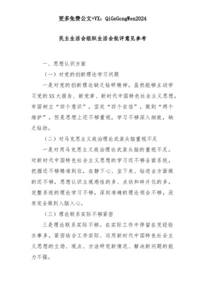 【七哥公文】2025年:民主生活会组织生活会批评意见参考+更多免费公文+VX:QiGeGongWen2024+更多免费公文+VX:QiGeGongWen2024