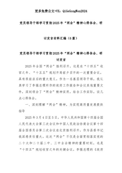 【七哥公文】2025年:(6篇)党员领导干部学习贯彻2025年“两会”精神心得体会、研讨发言材料汇编+更多免费公文+VX:QiGeGongWen2024+更多免费公文+VX:QiGeGongWen2024