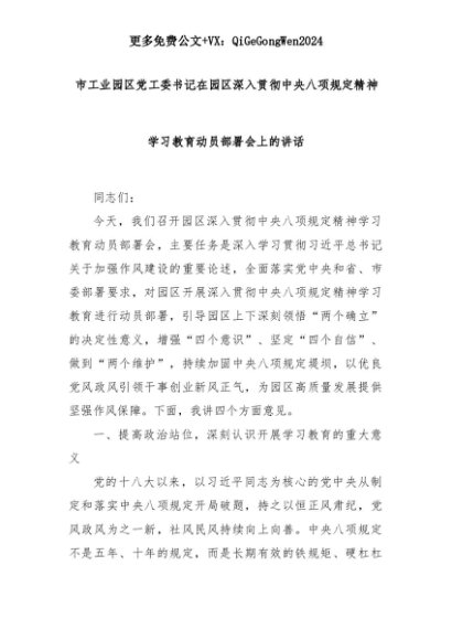 【七哥公文】2025年:市工业园区党工委书记在园区深入贯彻中央八项规定精神学习教育动员部署会上的讲话+更多免费公文+VX:QiGeGongWen2024+更多免费公文+VX:QiGeGongWen2024