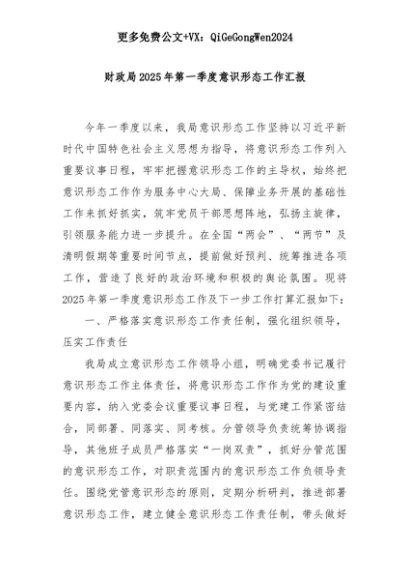 【七哥公文】2025年:财政局2025年第一季度意识形态工作汇报+更多免费公文+VX:QiGeGongWen2024+更多免费公文+VX:QiGeGongWen2024