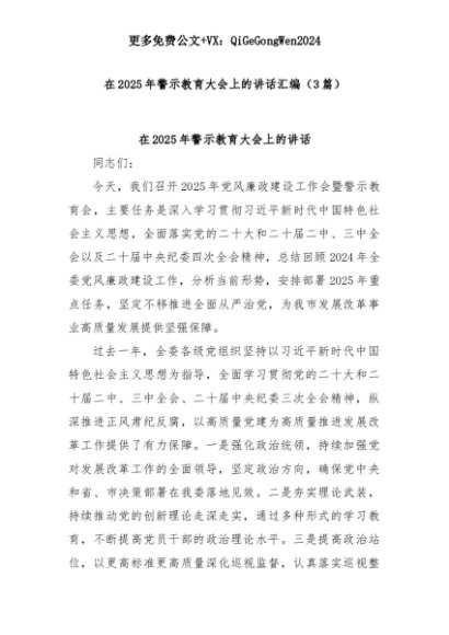 【七哥公文】2025年:(3篇)在2025年警示教育大会上的讲话汇编+更多免费公文+VX:QiGeGongWen2024+更多免费公文+VX:QiGeGongWen2024