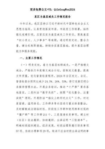 【七哥公文】2025年:某区为基层减负工作情况报告+更多免费公文+VX:QiGeGongWen2024+更多免费公文+VX:QiGeGongWen2024