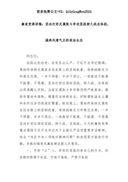 【七哥公文】2025年:廉政党课讲稿:坚决打好反腐败斗争攻坚战持久战总体战,涵养风清气正的政治生态+更多免费公文+VX:QiGeGongWen2024+更多免费公文+VX:QiGeGongWen2024