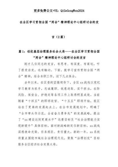 【七哥公文】2025年:(2篇)在全区学习贯彻全国“两会”精神理论中心组研讨会的发言+更多免费公文+VX:QiGeGongWen2024+更多免费公文+VX:QiGeGongWen2024