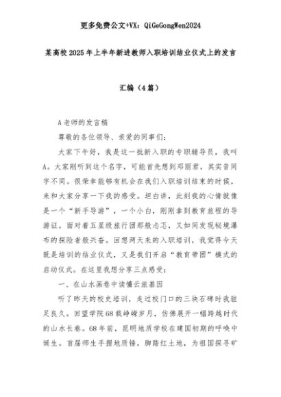 【七哥公文】2025年:(4篇)某高校2025年上半年新进教师入职培训结业仪式上的发言汇编+更多免费公文+VX:QiGeGongWen2024+更多免费公文+VX:QiGeGongWen2024