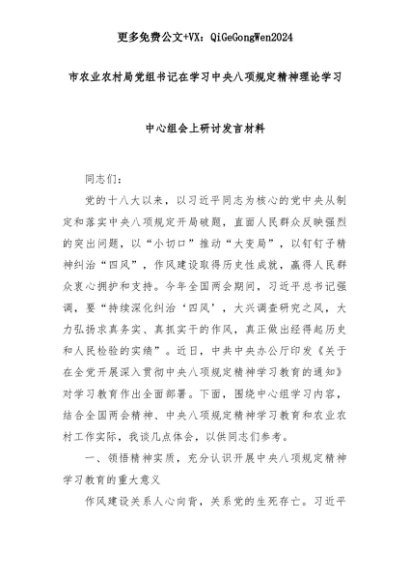【七哥公文】2025年:市农业农村局党组书记在学习中央八项规定精神理论学习中心组会上研讨发言材料+更多免费公文+VX:QiGeGongWen2024+更多免费公文+VX:QiGeGongWen2024