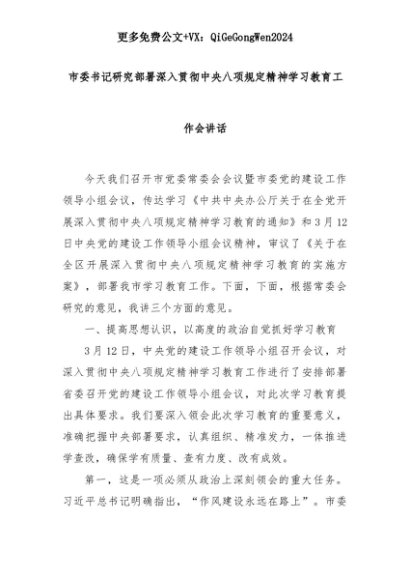 【七哥公文】2025年:市委书记研究部署深入贯彻中央八项规定精神学习教育工作会讲话+更多免费公文+VX:QiGeGongWen2024+更多免费公文+VX:QiGeGongWen2024