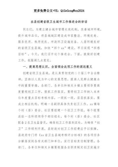 【七哥公文】2025年:在县创建省级卫生城市工作推进会的讲话+更多免费公文+VX:QiGeGongWen2024+更多免费公文+VX:QiGeGongWen2024