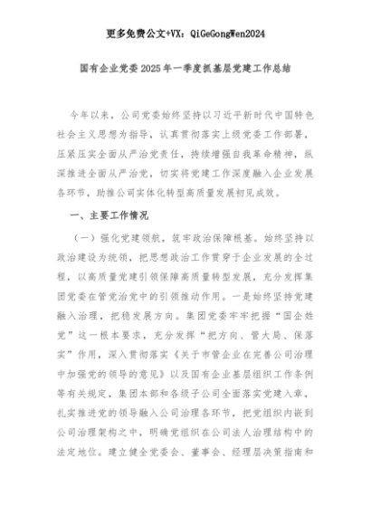 【七哥公文】2025年:国有企业党委2025年一季度抓基层党建工作总结+更多免费公文+VX:QiGeGongWen2024+更多免费公文+VX:QiGeGongWen2024