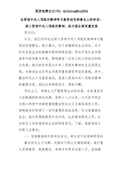 【七哥公文】2025年:在贯彻中央八项规定精神学习教育动员部署会上的讲话:深入贯彻中央八项规定精神,助力国企高质量发展+更多免费公文+VX:QiGeGongWen2024+更多免费公文+VX:QiGeGongWen2024
