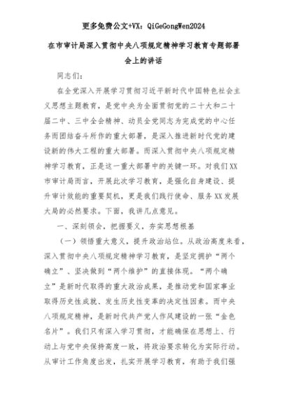 【七哥公文】2025年:在市审计局深入贯彻中央八项规定精神学习教育专题部署会上的讲话+更多免费公文+VX:QiGeGongWen2024+更多免费公文+VX:QiGeGongWen2024