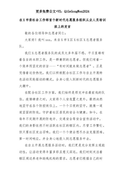 【七哥公文】2025年:在X市委社会工作部首个新时代志愿服务组织从业人员培训班上的发言+更多免费公文+VX:QiGeGongWen2024+更多免费公文+VX:QiGeGongWen2024