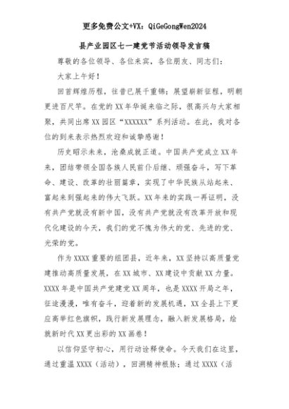 【七哥公文】2025年:县产业园区七一建党节活动领导发言稿+更多免费公文+VX:QiGeGongWen2024+更多免费公文+VX:QiGeGongWen2024