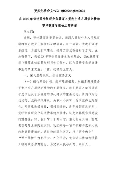【七哥公文】2025年:在2025年审计局党组研究部署深入贯彻中央八项规定精神学习教育专题会上的讲话+更多免费公文+VX:QiGeGongWen2024+更多免费公文+VX:QiGeGongWen2024