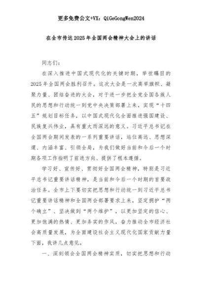 【七哥公文】2025年:在全市传达2025年全国两会精神大会上的讲话+更多免费公文+VX:QiGeGongWen2024+更多免费公文+VX:QiGeGongWen2024