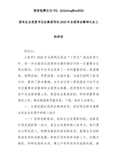 【七哥公文】2025年:国有企业党委书记在集团传达2025年全国两会精神大会上的讲话+更多免费公文+VX:QiGeGongWen2024+更多免费公文+VX:QiGeGongWen2024