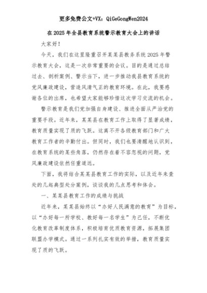 【七哥公文】2025年:在2025年全县教育系统警示教育大会上的讲话+更多免费公文+VX:QiGeGongWen2024+更多免费公文+VX:QiGeGongWen2024