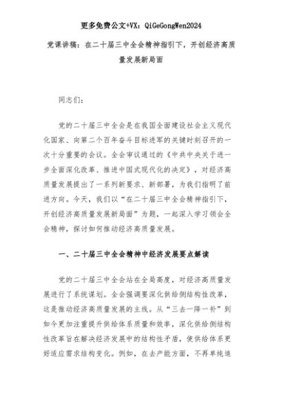 【七哥公文】2025年:党课讲稿:在二十届三中全会精神指引下,开创经济高质量发展新局面+更多免费公文+VX:QiGeGongWen2024+更多免费公文+VX:QiGeGongWen2024