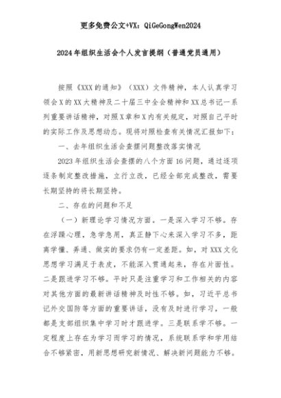 【七哥公文】2025年:2024年组织生活会个人发言提纲(普通党员通用)+更多免费公文+VX:QiGeGongWen2024+更多免费公文+VX:QiGeGongWen2024