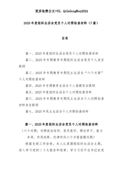 【七哥公文】2025年:(7篇)2025年度组织生活会党员个人对照检查材料+更多免费公文+VX:QiGeGongWen2024+更多免费公文+VX:QiGeGongWen2024