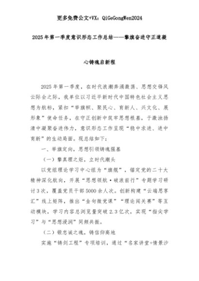 【七哥公文】2025年:2025年第一季度意识形态工作总结——擎旗奋进守正道 凝心铸魂启新程+更多免费公文+VX:QiGeGongWen2024+更多免费公文+VX:QiGeGongWen2024