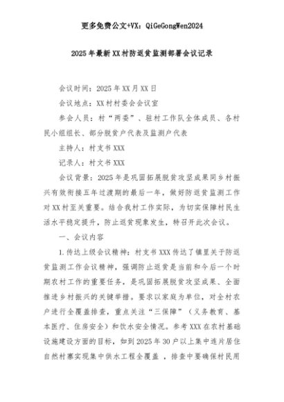 【七哥公文】2025年:2025年最新XX村防返贫监测部署会议记录+更多免费公文+VX:QiGeGongWen2024+更多免费公文+VX:QiGeGongWen2024
