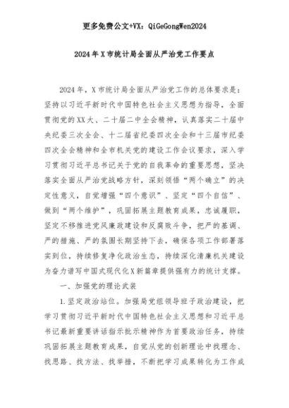【七哥公文】2025年:2024年X市统计局全面从严治党工作要点+更多免费公文+VX:QiGeGongWen2024+更多免费公文+VX:QiGeGongWen2024