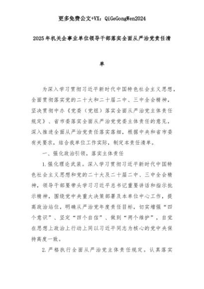 【七哥公文】2025年:2025年机关企事业单位领导干部落实全面从严治党责任清单+更多免费公文+VX:QiGeGongWen2024+更多免费公文+VX:QiGeGongWen2024