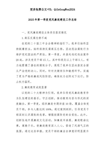 【七哥公文】2025年:2025年第一季度党风廉政建设工作总结+更多免费公文+VX:QiGeGongWen2024+更多免费公文+VX:QiGeGongWen2024