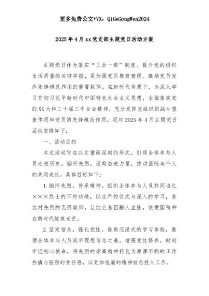 【七哥公文】2025年:2025年4月xx党支部主题党日活动方案+更多免费公文+VX:QiGeGongWen2024+更多免费公文+VX:QiGeGongWen2024