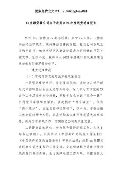 【七哥公文】2025年:XX金融贷款公司班子成员2024年度述责述廉报告+更多免费公文+VX:QiGeGongWen2024+更多免费公文+VX:QiGeGongWen2024