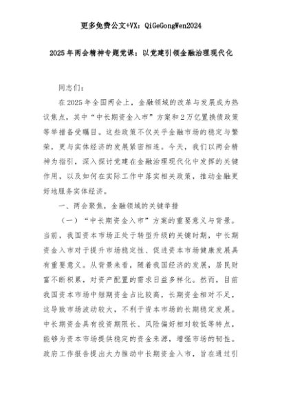 【七哥公文】2025年:2025年两会精神专题党课:以党建引领金融治理现代化+更多免费公文+VX:QiGeGongWen2024+更多免费公文+VX:QiGeGongWen2024