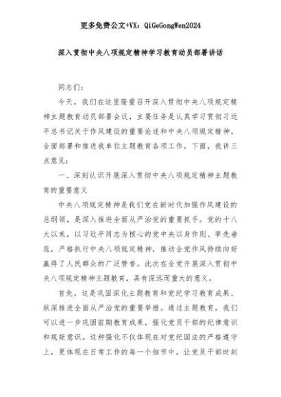 【七哥公文】2025年:深入贯彻中央八项规定精神学习教育动员部署讲话+更多免费公文+VX:QiGeGongWen2024+更多免费公文+VX:QiGeGongWen2024