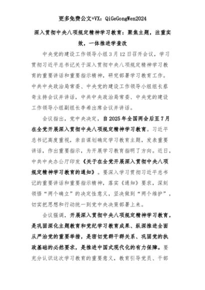 【七哥公文】2025年:深入贯彻中央八项规定精神学习教育:聚焦主题,注重实效,一体推进学查改+更多免费公文+VX:QiGeGongWen2024+更多免费公文+VX:QiGeGongWen2024