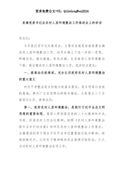 【七哥公文】2025年:某镇党委书记在农村人居环境整治工作推进会上的讲话+更多免费公文+VX:QiGeGongWen2024+更多免费公文+VX:QiGeGongWen2024
